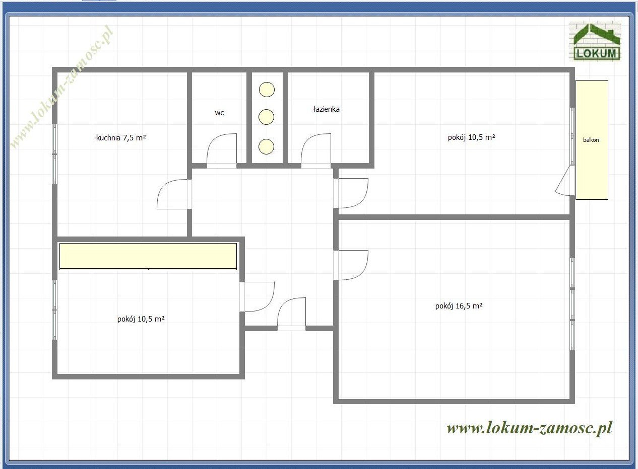 Pomieszczenia: trzy pokoje (16,5, 14 i 10,5m2) , kuchnia (7,5m2), łazienka, wc, przedpokój;