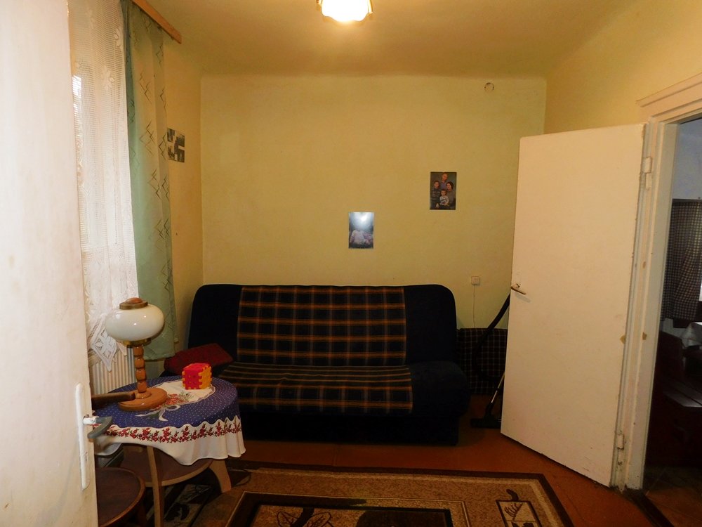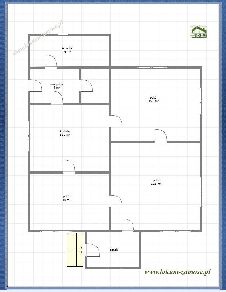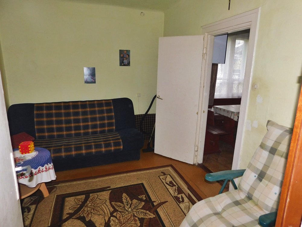 Pomieszczenia: 3 pokoje, kuchnia, przedpokój, łazienka, ganek.