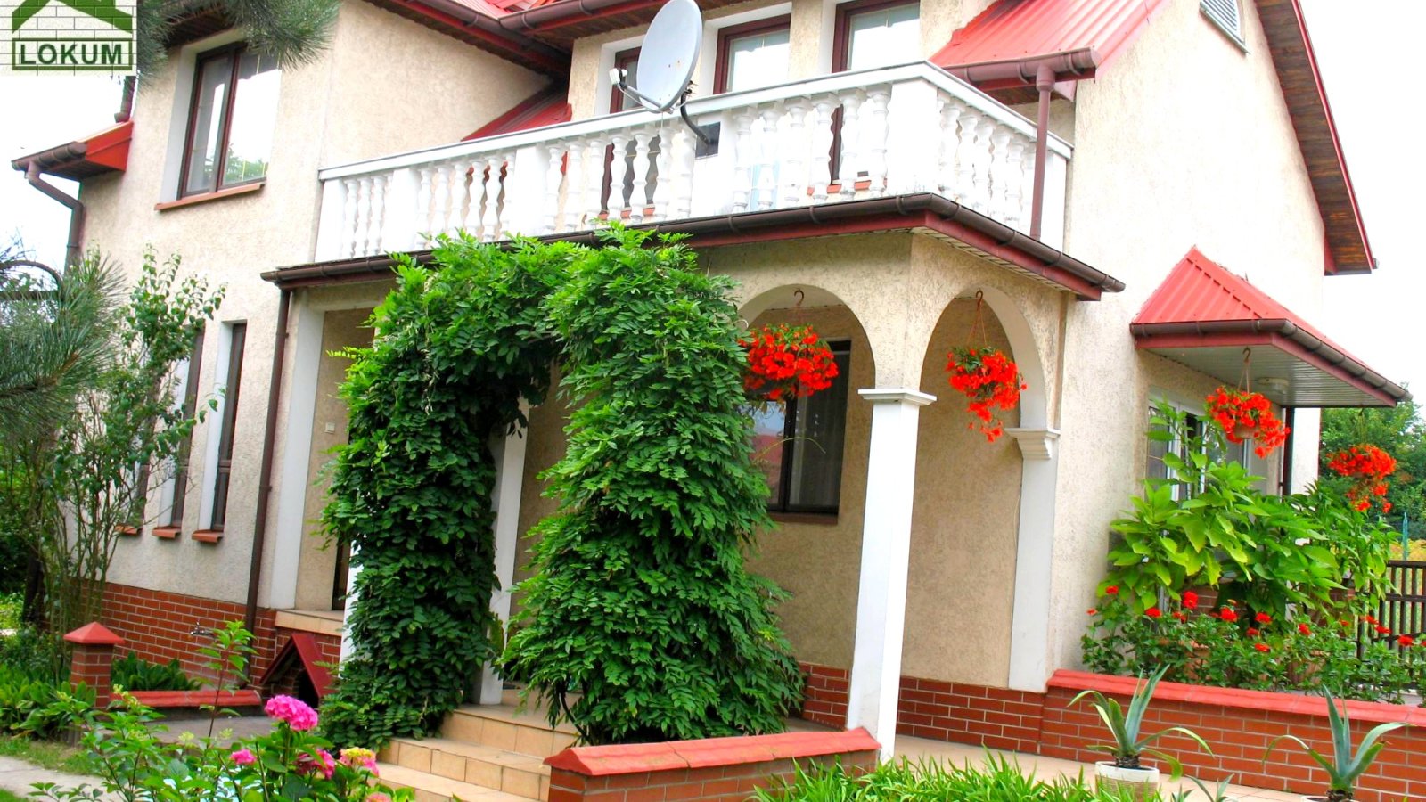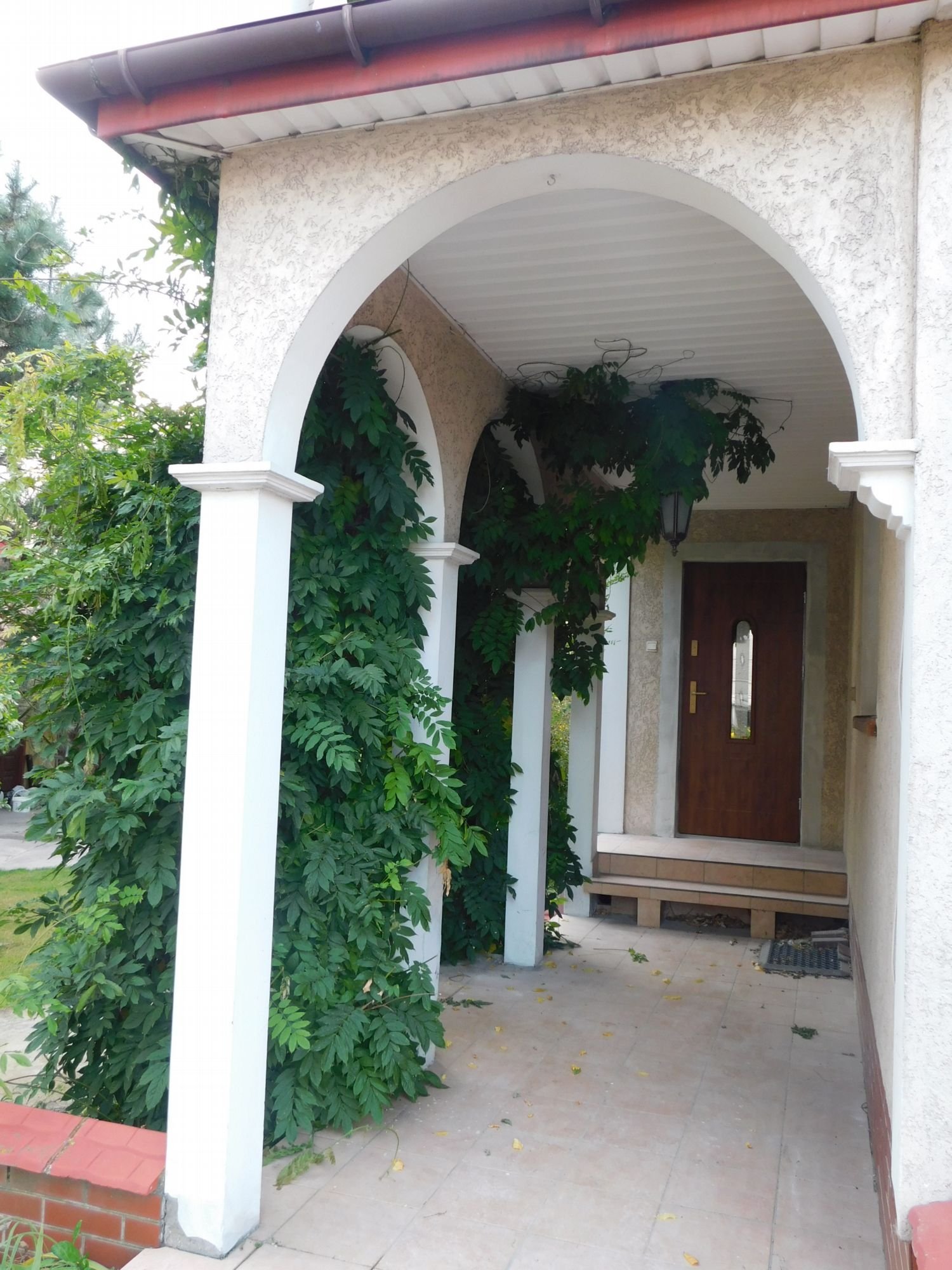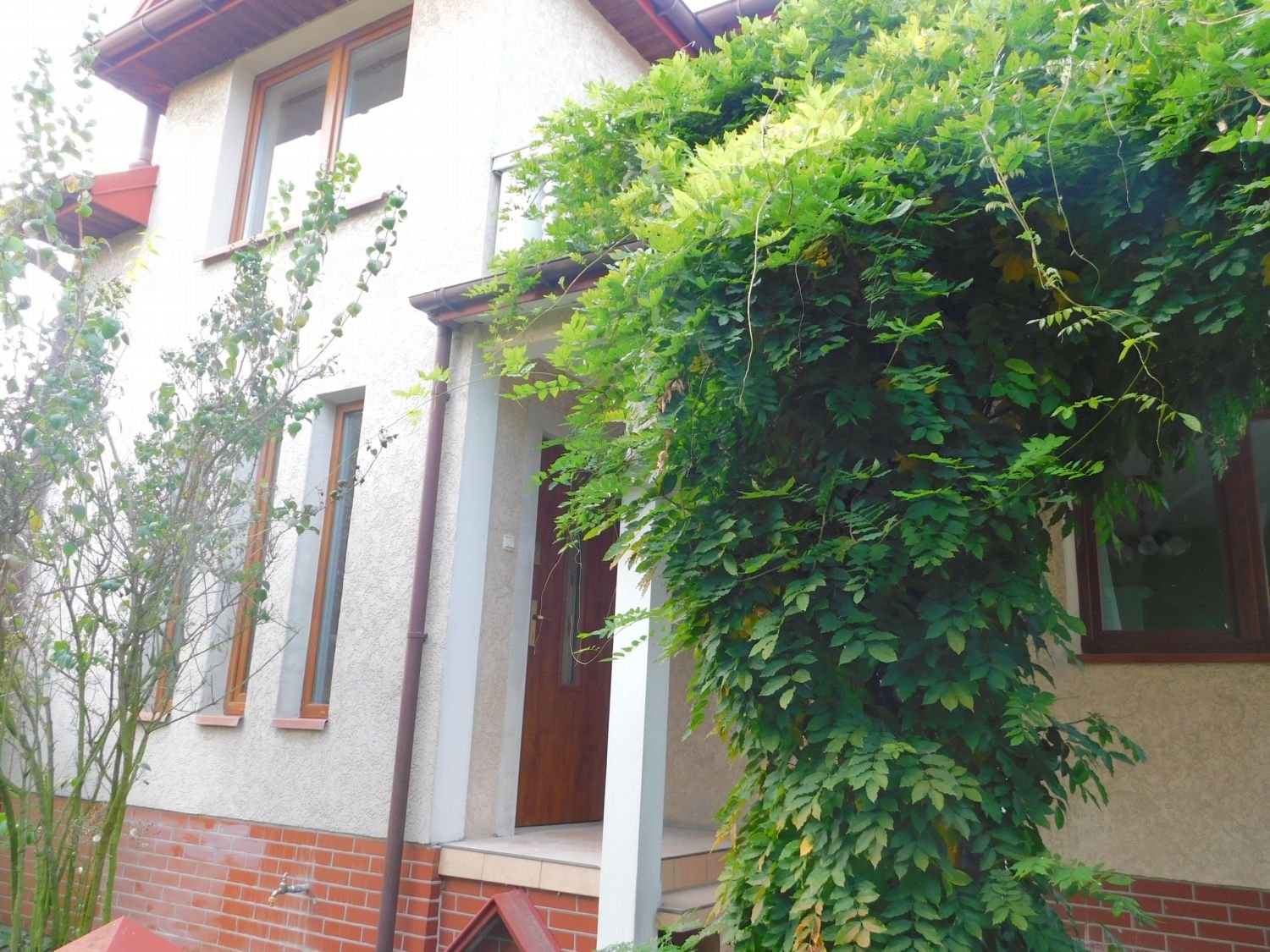 Prezentowana nieruchomość to budynek dwukondygnacyjny o ciekawej architekturze w pełni podpiwniczony. Do drzwi wejściowych prowadzi dość długie podcienie, które pełni funkcję dekoracyjną elewacji, jak również osłaniającą przed wiatrem i deszczem. Na piętrze nad podcieniem znajduje się duży taras o powierzchni ponad 8 m2..