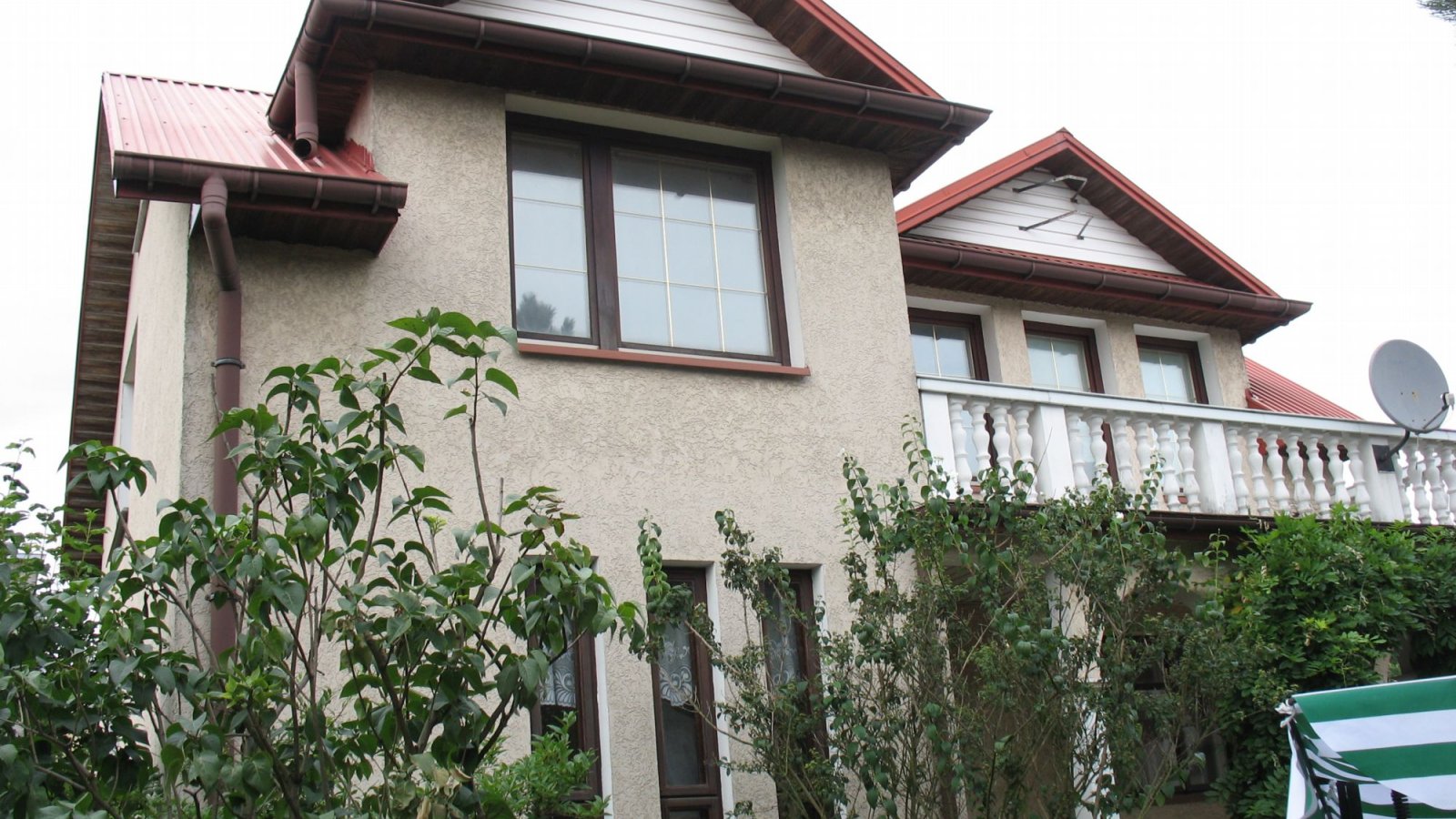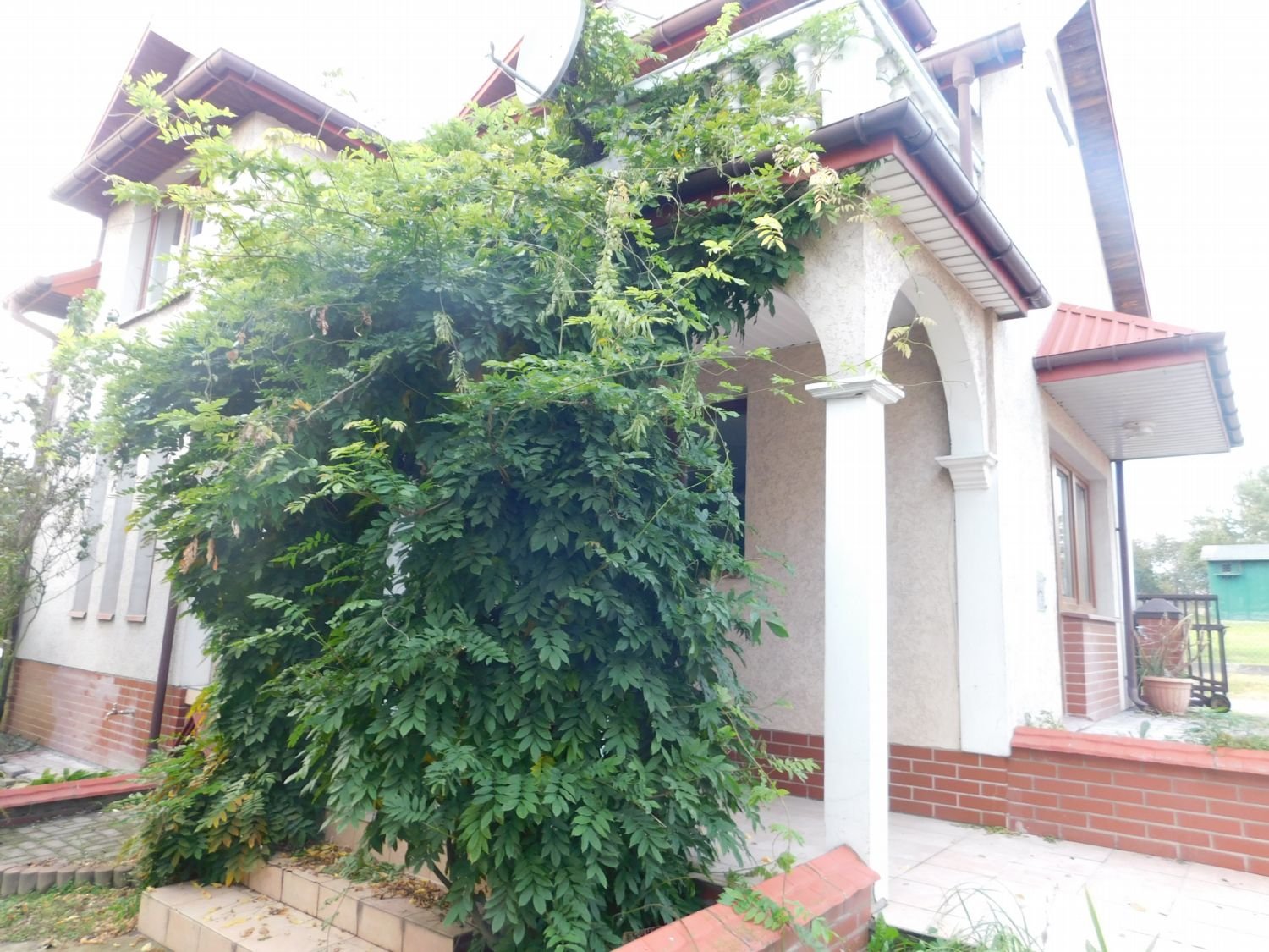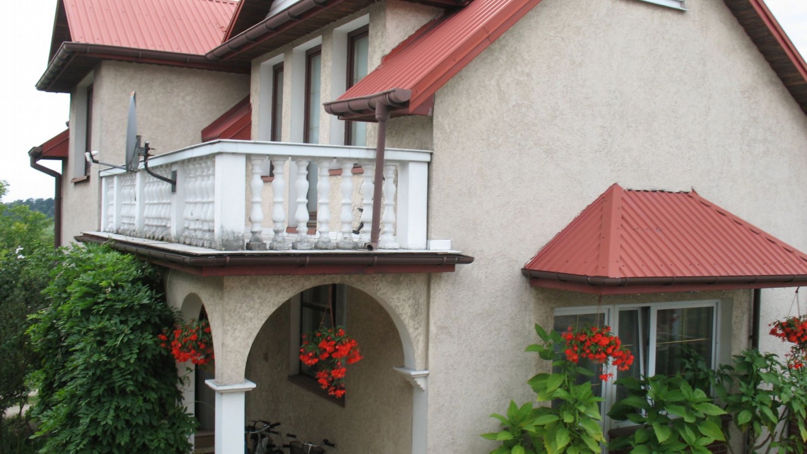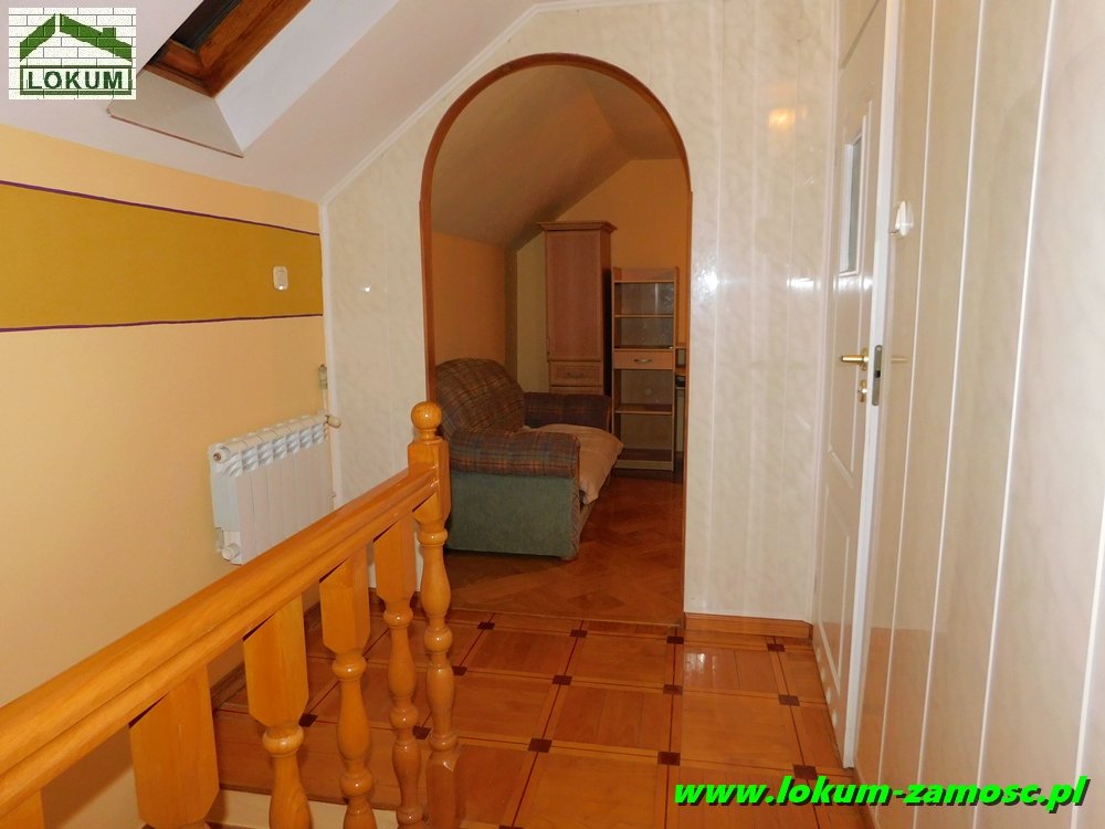 Prezentowana nieruchomość to budynek dwukondygnacyjny o ciekawej architekturze w pełni podpiwniczony. Do drzwi wejściowych prowadzi dość długie podcienie, które pełni funkcję dekoracyjną elewacji, jak również osłaniającą przed wiatrem i deszczem. Na piętrze nad podcieniem znajduje się duży taras o powierzchni ponad 8 m2..