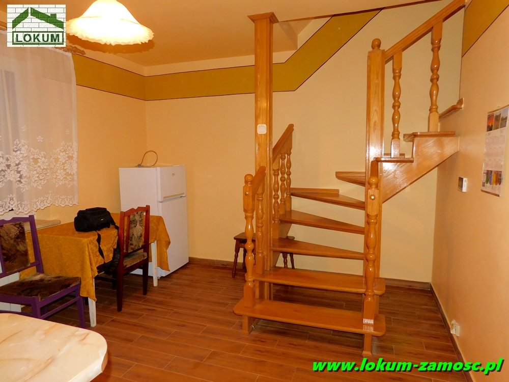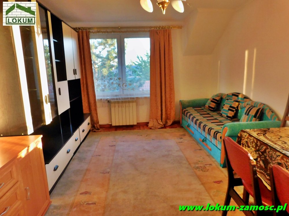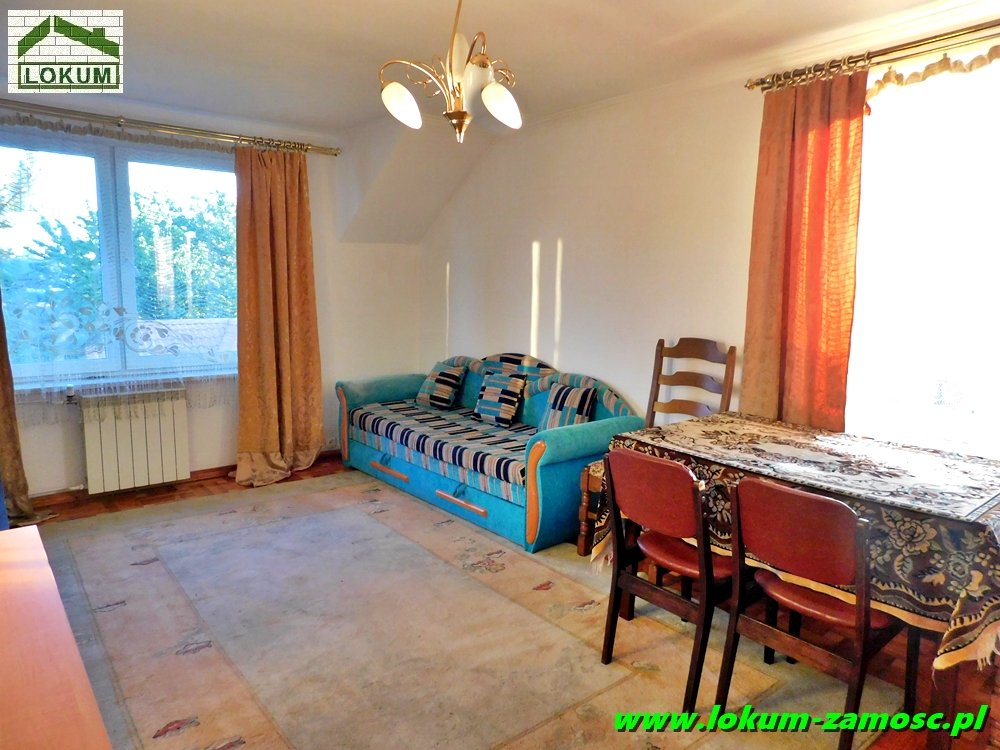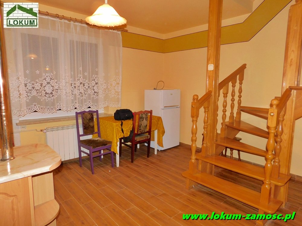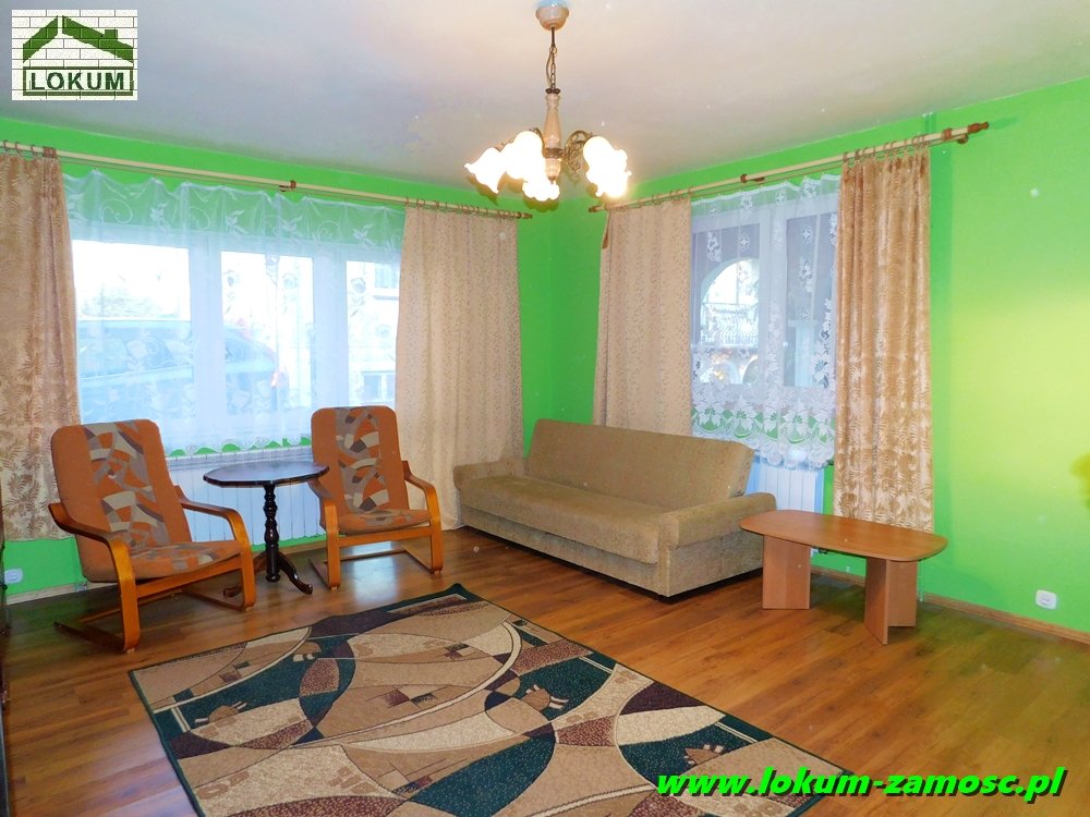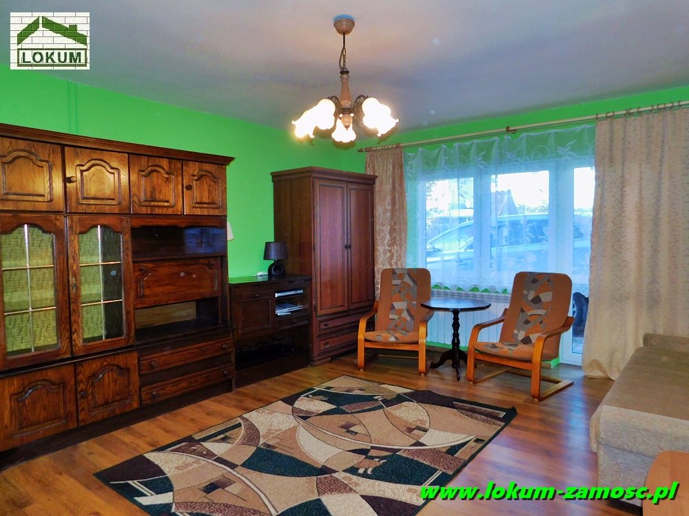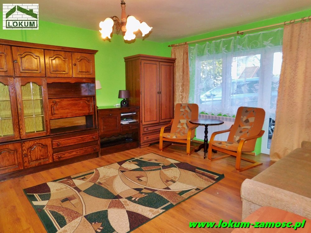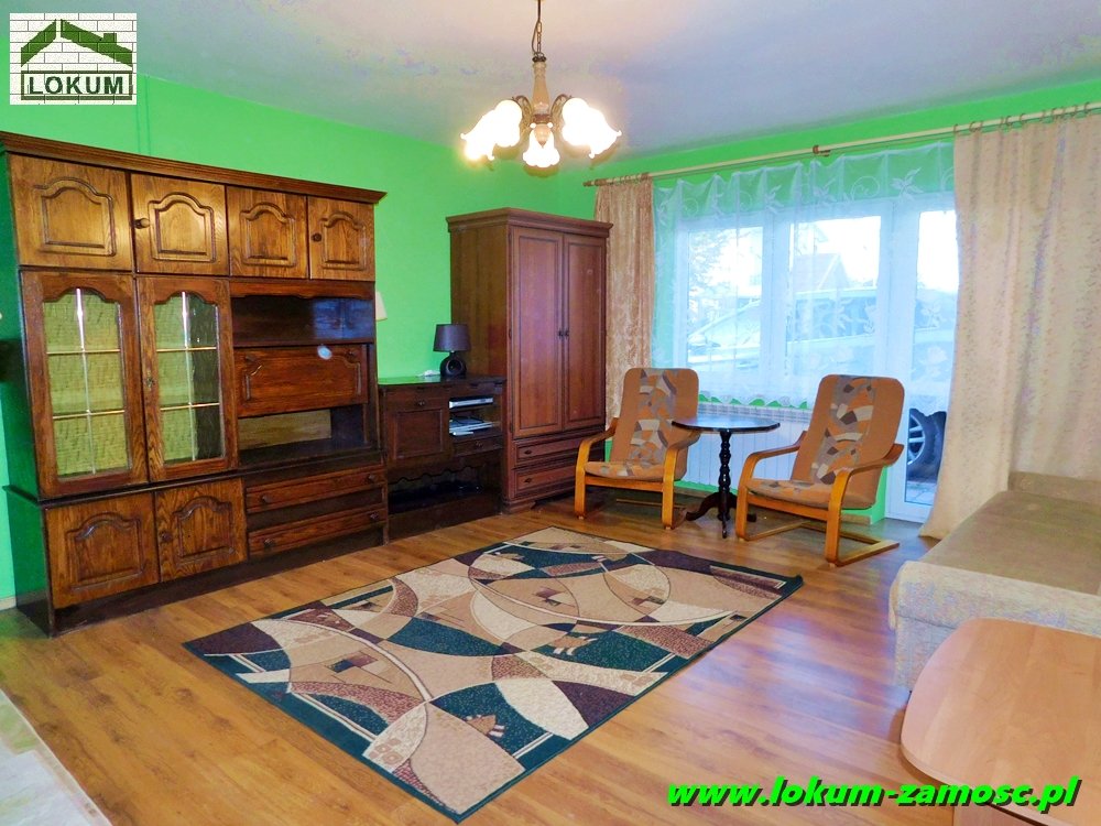 Mniejszy pokój posiada wyjście na taras, natomiast z okien dużego pokoju rozpościera się malowniczy widok na pobliskie łąki .