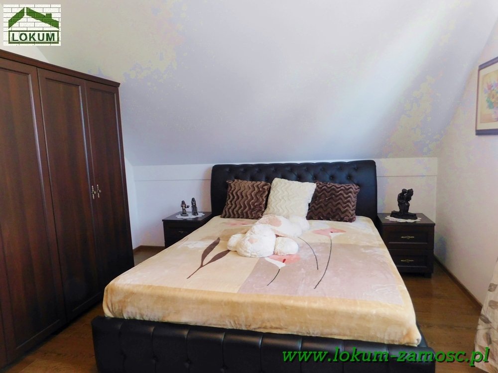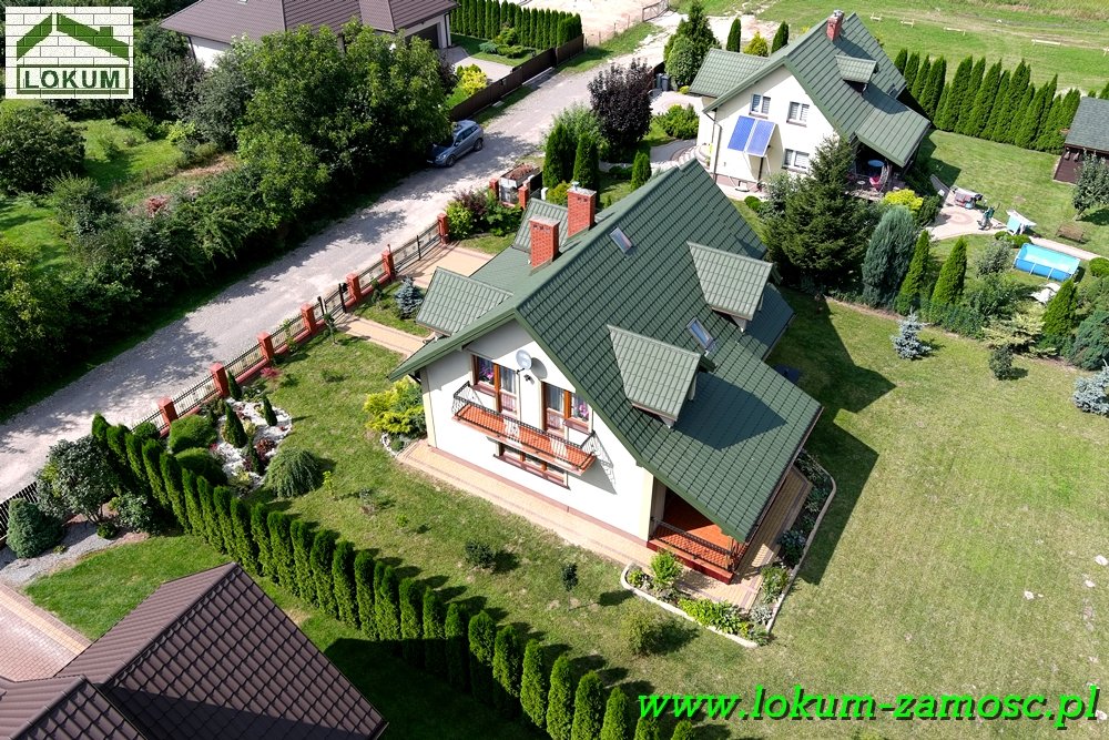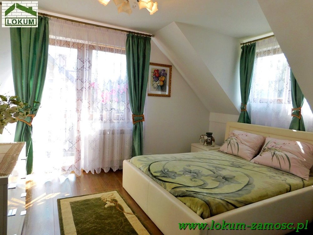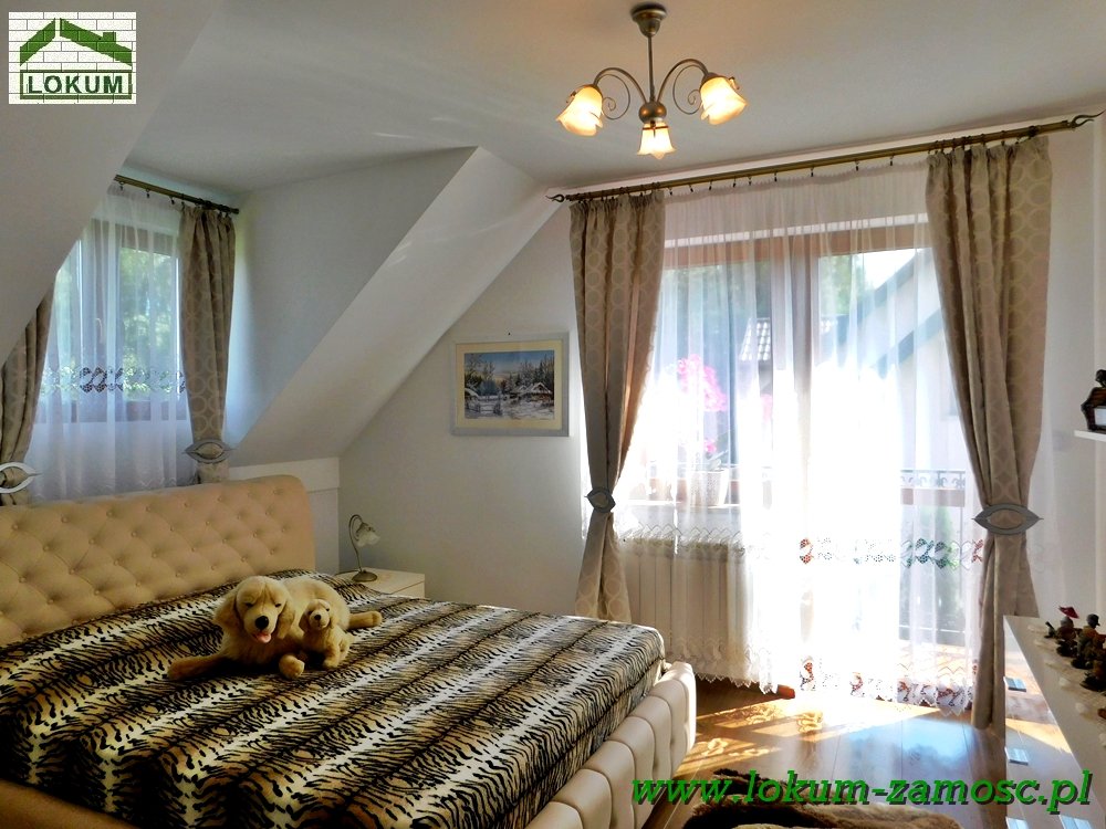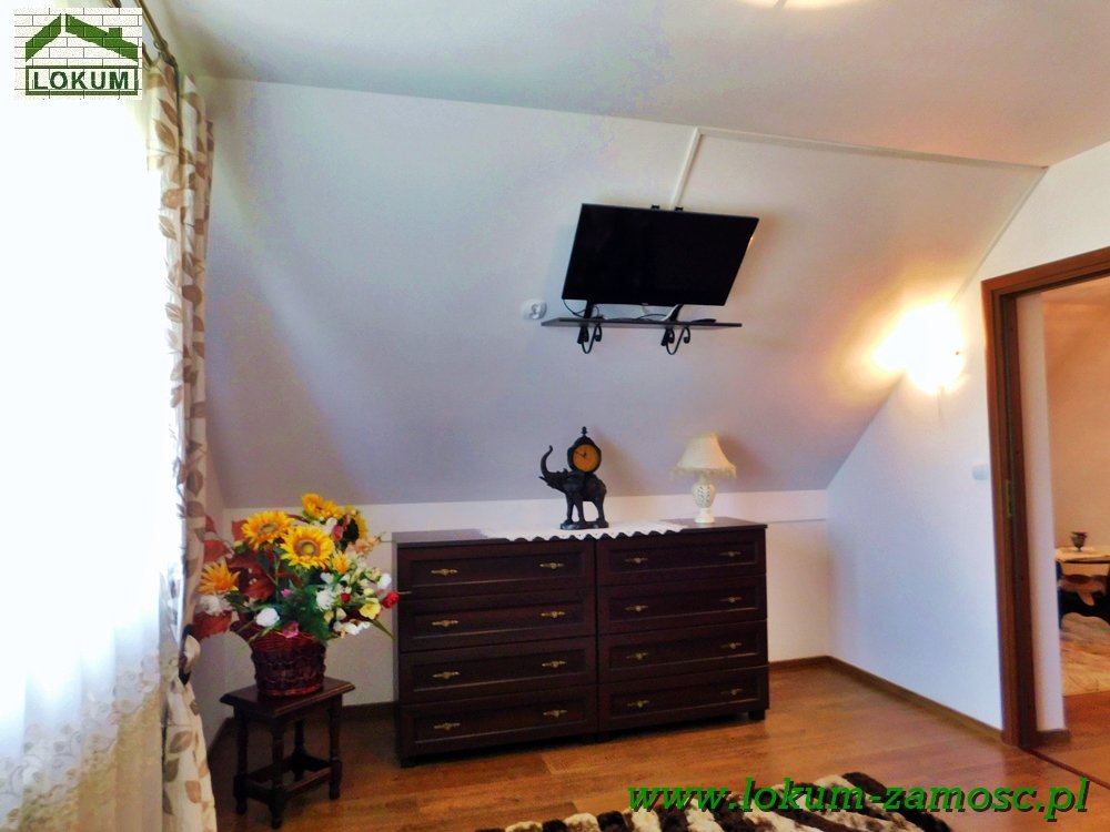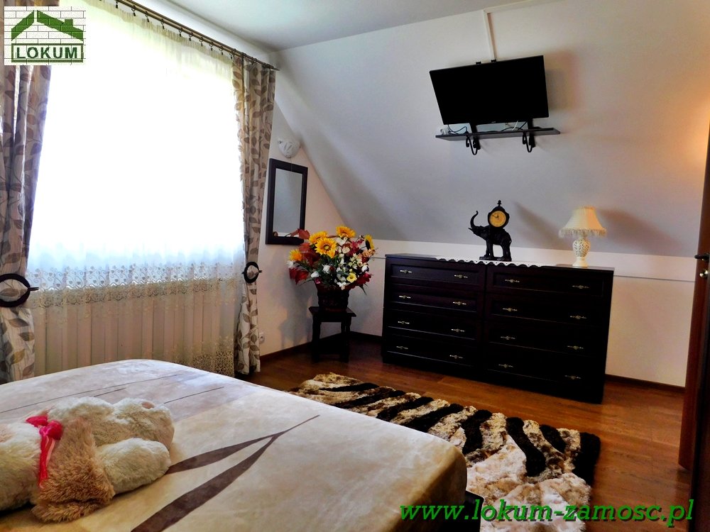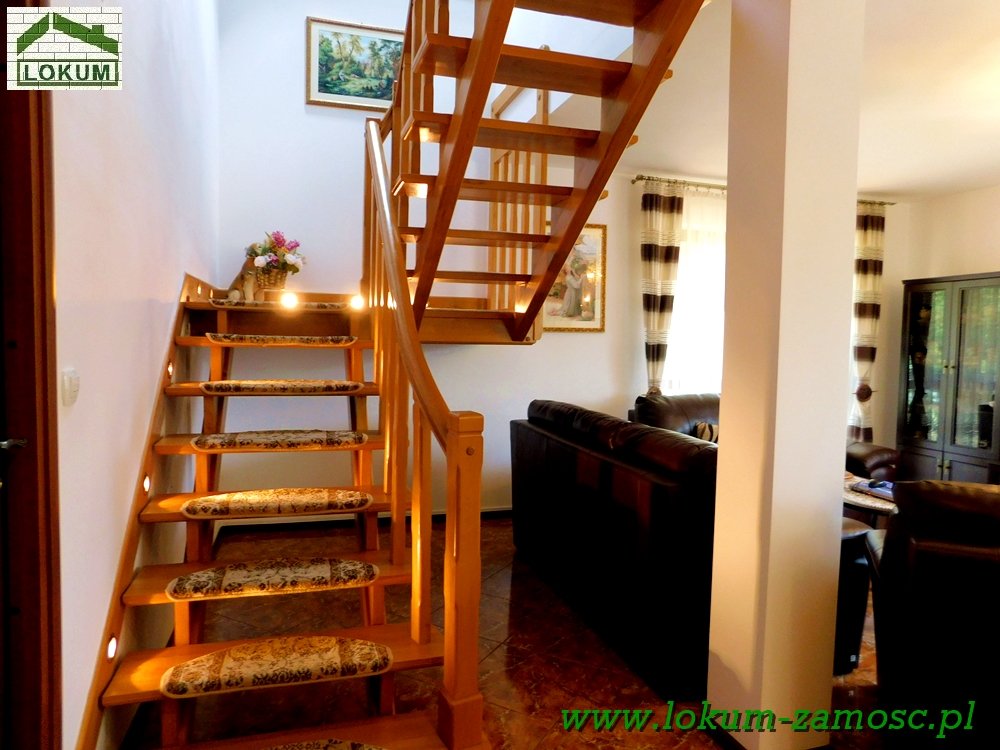 Na parterze znajduje się obszerny salon (z wyjściem na duży taras z tyłu budynku) oraz kuchnia , wiatrołap, hall, pokój, łazienka, pomieszczenie gospodarcze z wc , wiatrołap. Z poziomu parteru na poddasze prowadzą szerokie, solidne dębowe schody. Na poddaszu znajdują się 4 sypialnie (dwie z wyjściem na balkon), garderoba, hall oraz przestronna łazienka z wc.