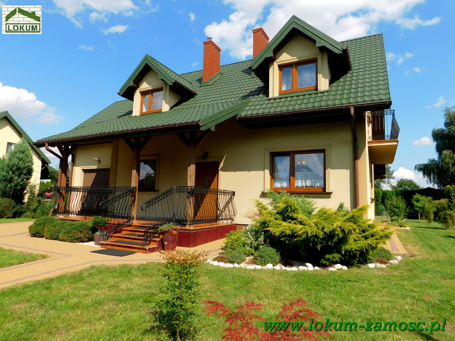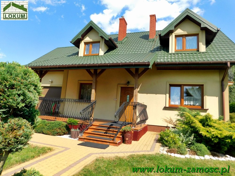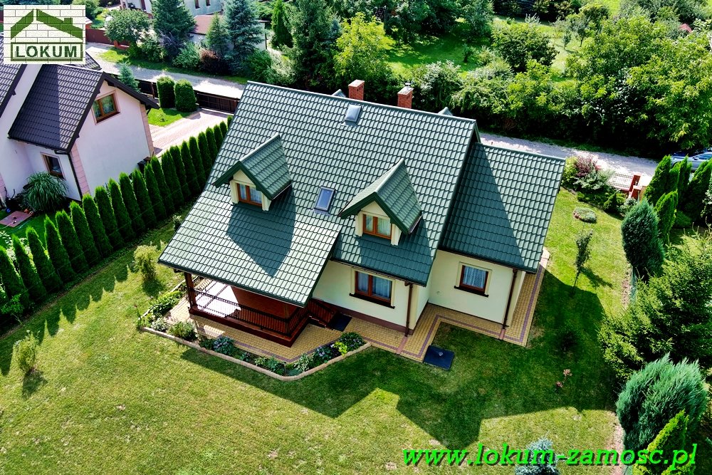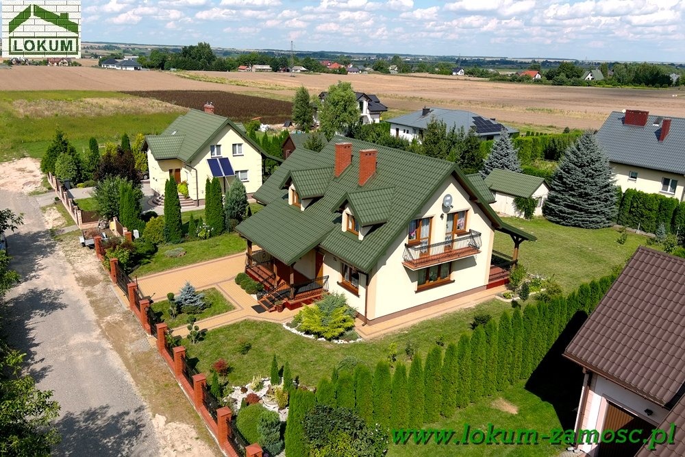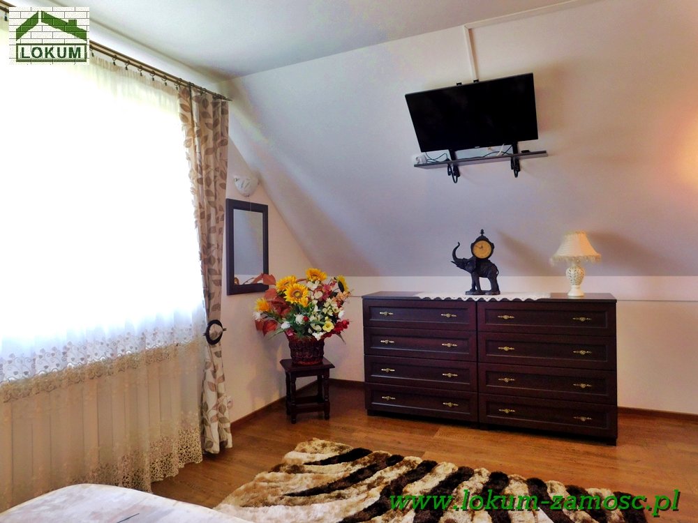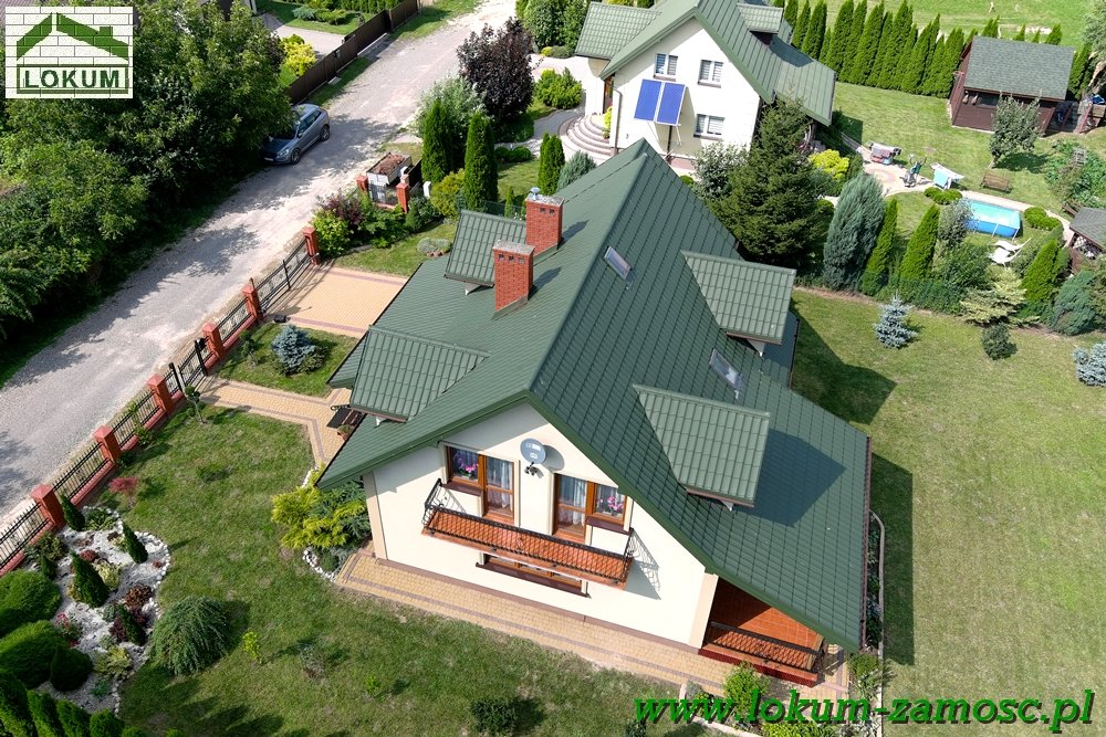 Na parterze znajduje się obszerny salon (z wyjściem na duży taras z tyłu budynku) oraz kuchnia , wiatrołap, hall, pokój, łazienka, pomieszczenie gospodarcze z wc , wiatrołap. Z poziomu parteru na poddasze prowadzą szerokie, solidne dębowe schody. Na poddaszu znajdują się 4 sypialnie (dwie z wyjściem na balkon), garderoba, hall oraz przestronna łazienka z wc.