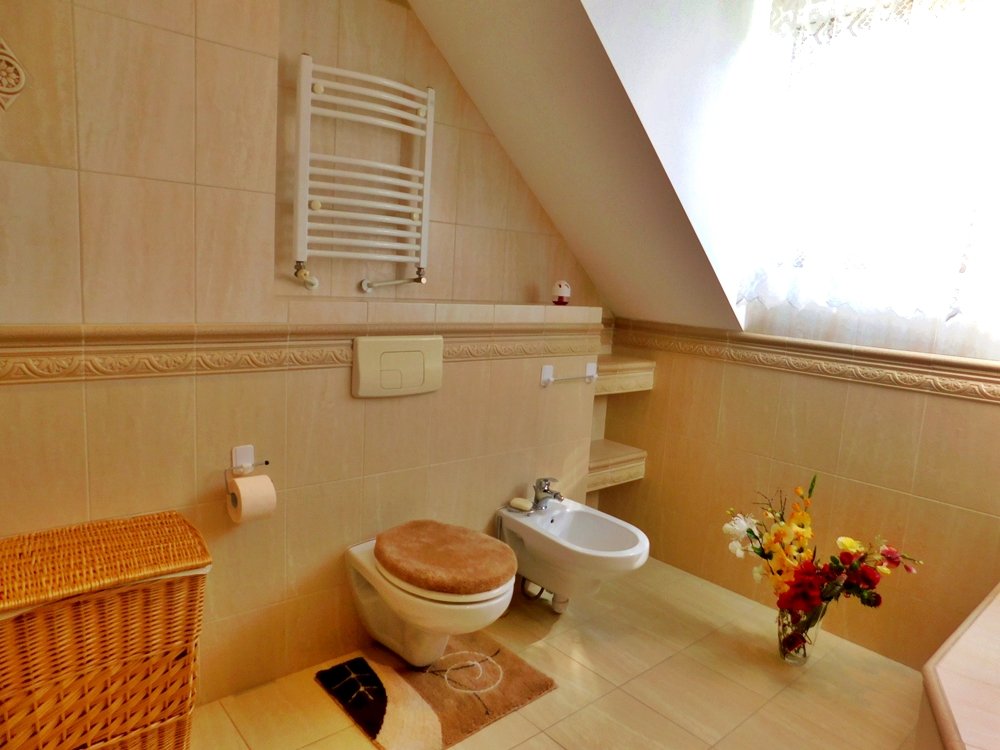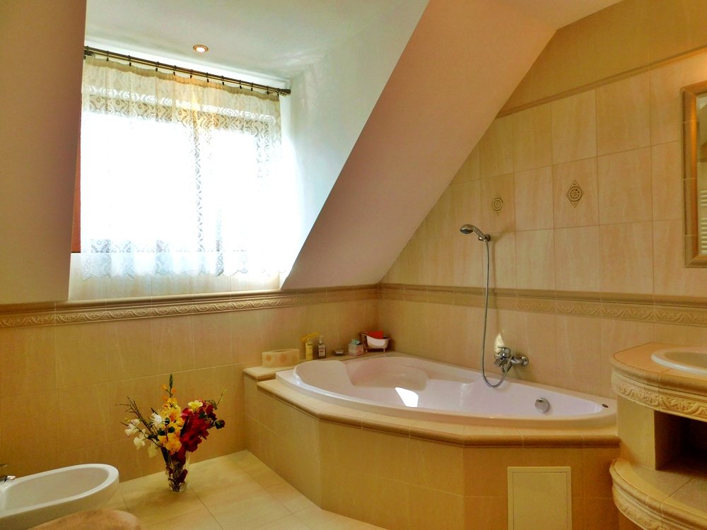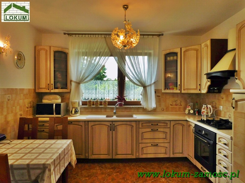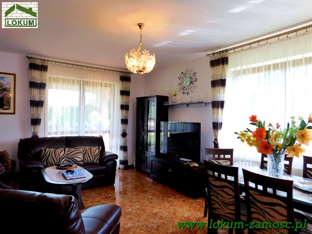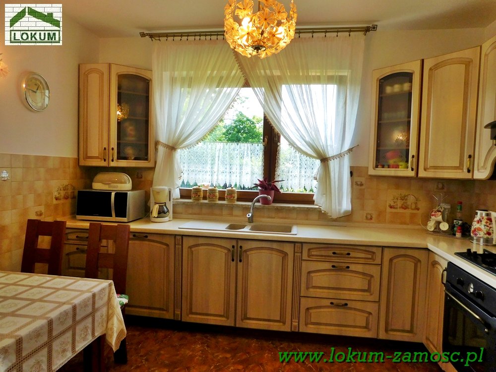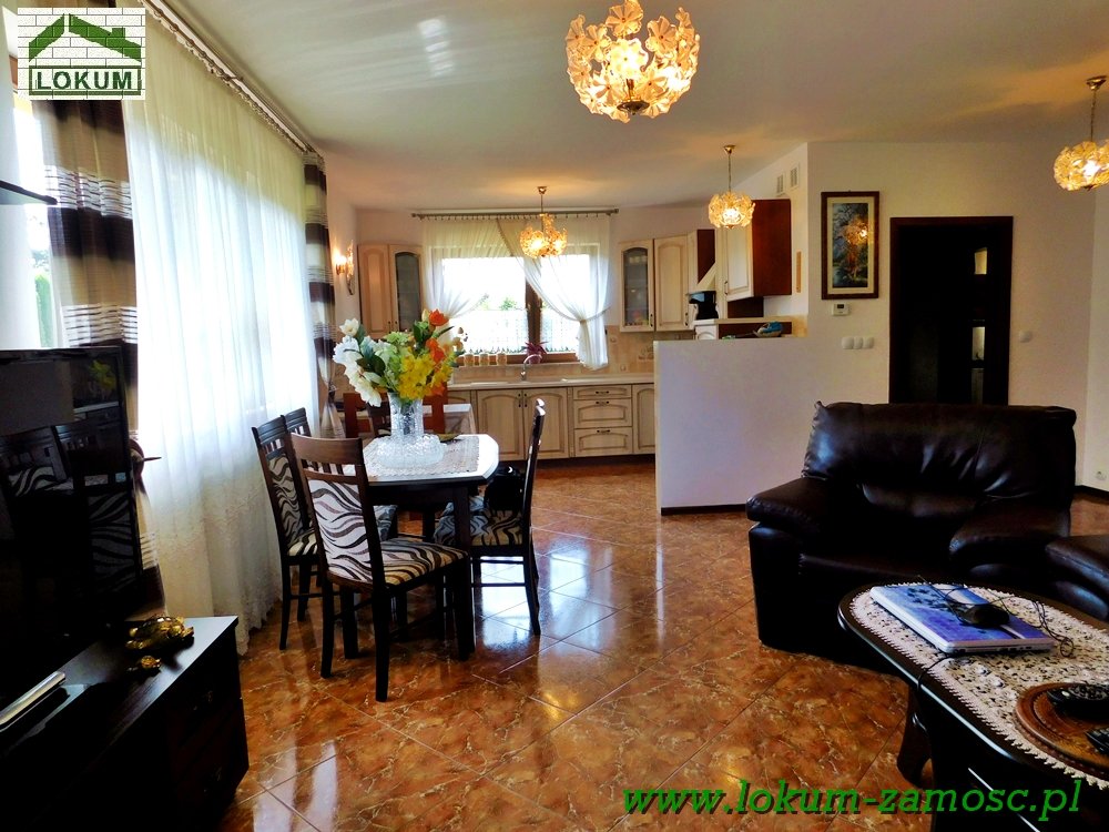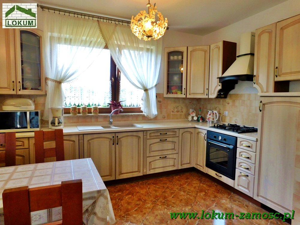 Na parterze znajduje się obszerny salon (z wyjściem na duży taras z tyłu budynku) oraz kuchnia , wiatrołap, hall, pokój, łazienka, pomieszczenie gospodarcze z wc , wiatrołap. Z poziomu parteru na poddasze prowadzą szerokie, solidne dębowe schody. Na poddaszu znajdują się 4 sypialnie (dwie z wyjściem na balkon), garderoba, hall oraz przestronna łazienka z wc.