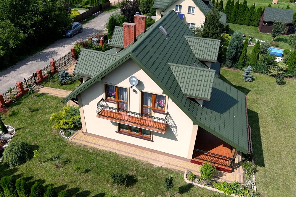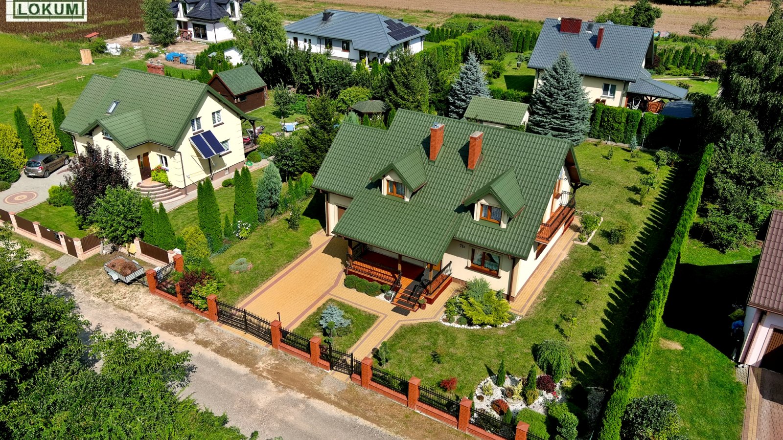 Dom wybudowany na bazie projektu „WB 3496” Pracowni Agrobisp. Budynek ocieplony, otynkowany, kryty blacho dachówką. Wyposażony w instalację elektryczną, gazową, wodociagową (ujęcie własne), kanalizacyjną (szambo), telekomunikacyjną, odkurzacz centralny.