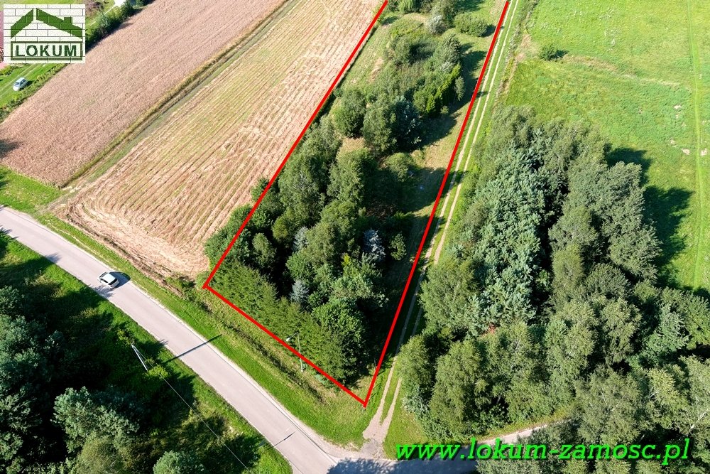 Działka przy drodze asfaltowej, ok. kilometra od drogi krajowej nr 17 ((…) – Zamość – Tomaszów Lubelski – (…)), w odległości mniej niż 25 km od Zamościa.